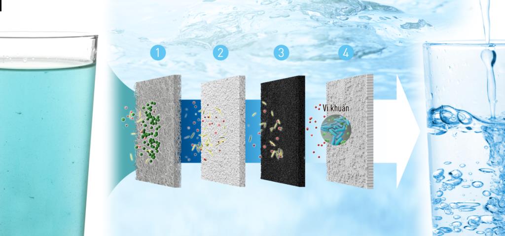 Bộ lọc được làm bằng bốn loại vật liệu có các lỗ kích thước khác nhau giúp loại bỏ hoàn toàn các chất có hại và 99,999% vi khuẩn. 1 Vải không dệt, 2 Sứ, 3 Than hoạt tính, 4 Màng sợi rỗng. (* Hình ảnh chỉ mang tính minh họa.)